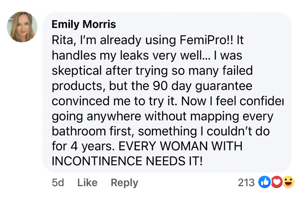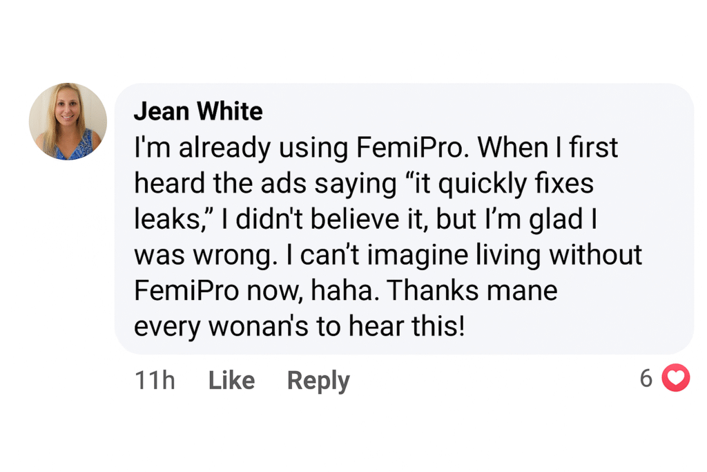 “Real protection exists that actually handles full bladder leaks while keeping you comfortable and confident. After trying everything, FemiPro is the only thing that actually works.”